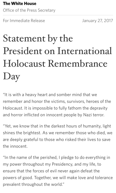On International Holocaust Remembrance Day, the Trump White House released a statement that made invisible six million Jews murdered in the Holocaust.
