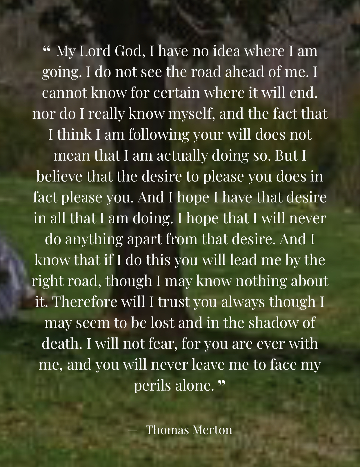 “Then it was as if I suddenly saw the secret beauty of their hearts, the depths of their hearts, where neither sin nor desire nor self-knowledge can reach, the core of their reality, the person that each one is in God’s eyes. If only they could all see themselves as they really are. If only we could see each other that way all the time.”