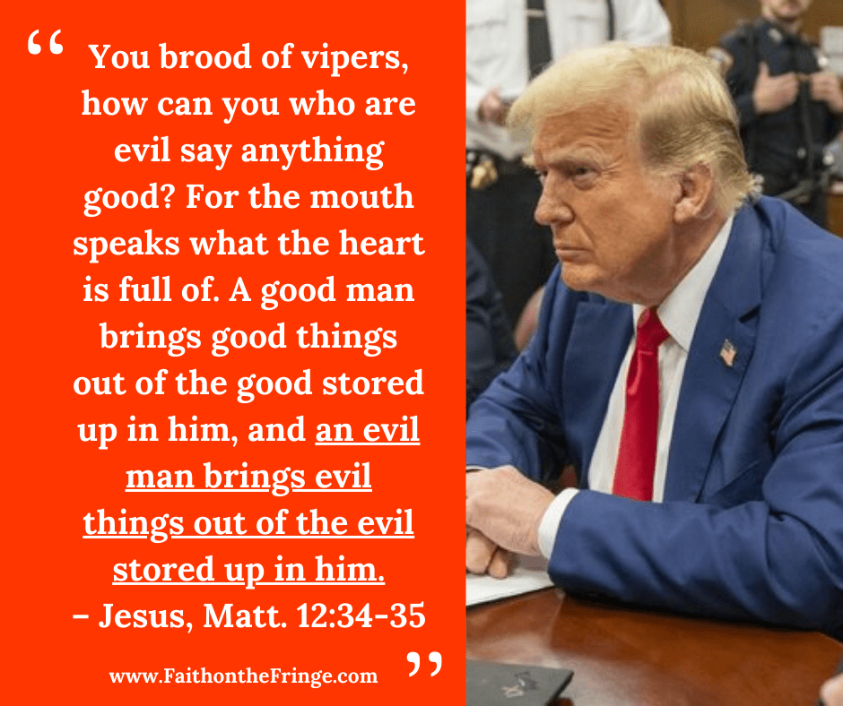 You get the idea. Follow the link for more scripture and memes that demonstrate Trump is the evil that the Bible warns against. I’m not cherry picking random verses, the totality of the Bible is clear on what good and evil look like. Jesus is good and Trump is evil.