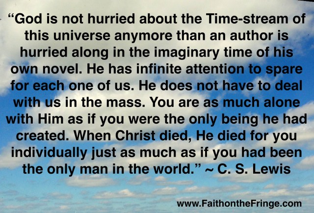 “God is not hurried about the time-stream of this universe anymore than an author is hurried along in the imaginary time of his own novel. He has infinite attention to spare for each one of us. He does not have to deal with us in the mass. You are as much alone with Him as if you were the only being he had created. When Christ died, He died for you individually just as much as if you had been the only man in the world.” ~ C. S. Lewis
